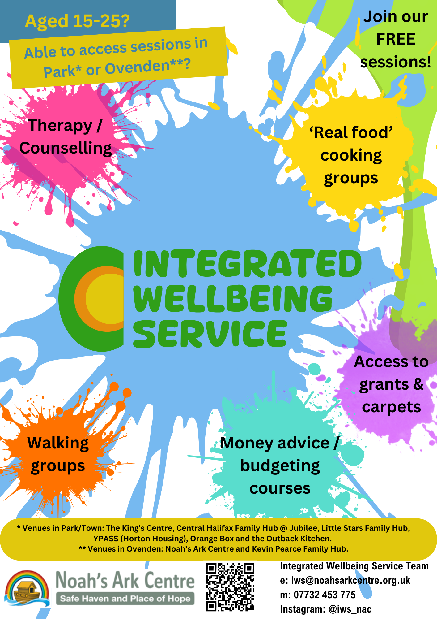 The Integrated Wellbeing Service (IWS) will provide interventions for Calderdale young people aged 15-25 years who wish to improve their emotional, mental and general wellbeing. The IWS aims to inclusively support young people who are NEET, SEND, Care Leavers and LGBTQ+. Interventions are provided within the areas of Central and North Halifax.